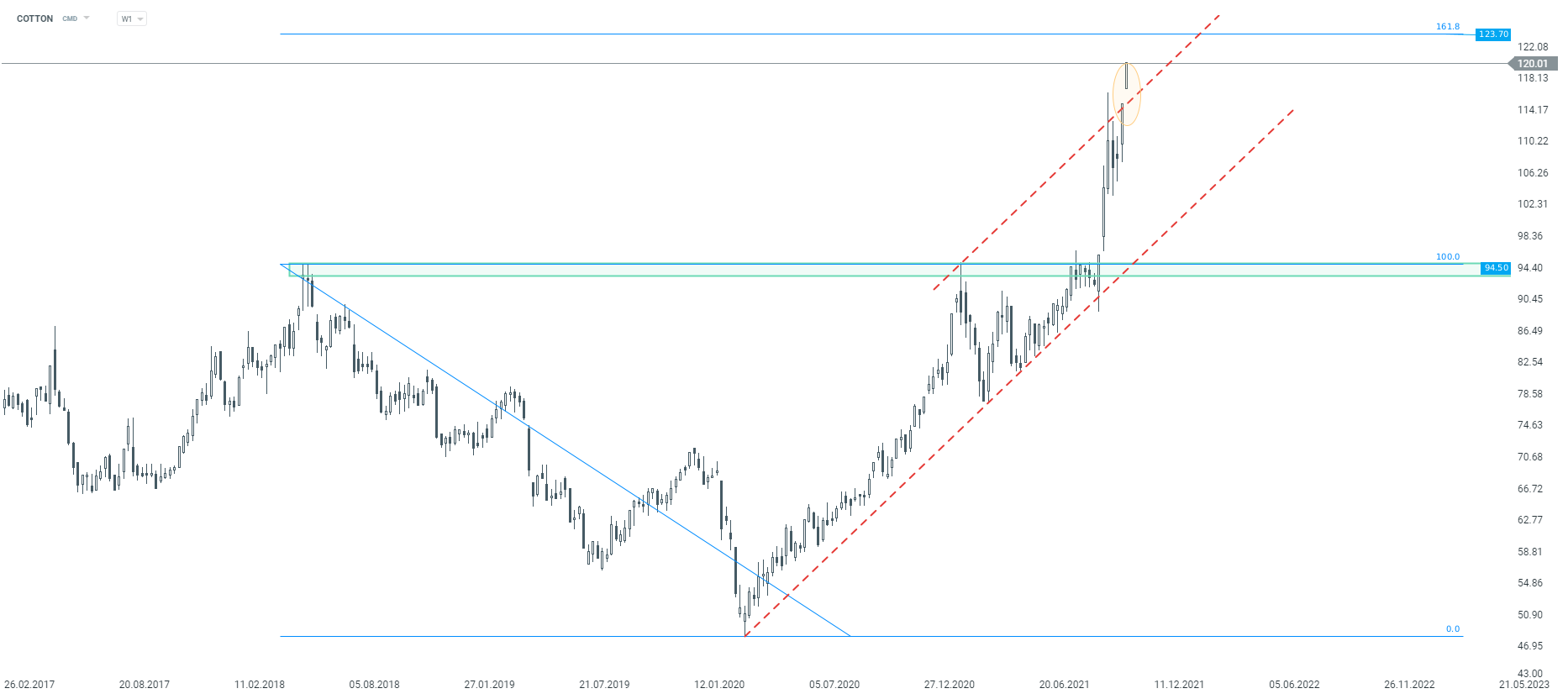 Cotton rallied to a 10-year high near $120.00 per pound. Agricultural commodity jumped above the upper limit of a steep upward channel this week. Weaker outlook for US and Indian crop is providing fuel for a cotton price rally. The nearest resistance to watch can be found in the $123.70 area, where the exterior 161.8% retracement of the 2018-2020 drop can be found. Source: xStation5