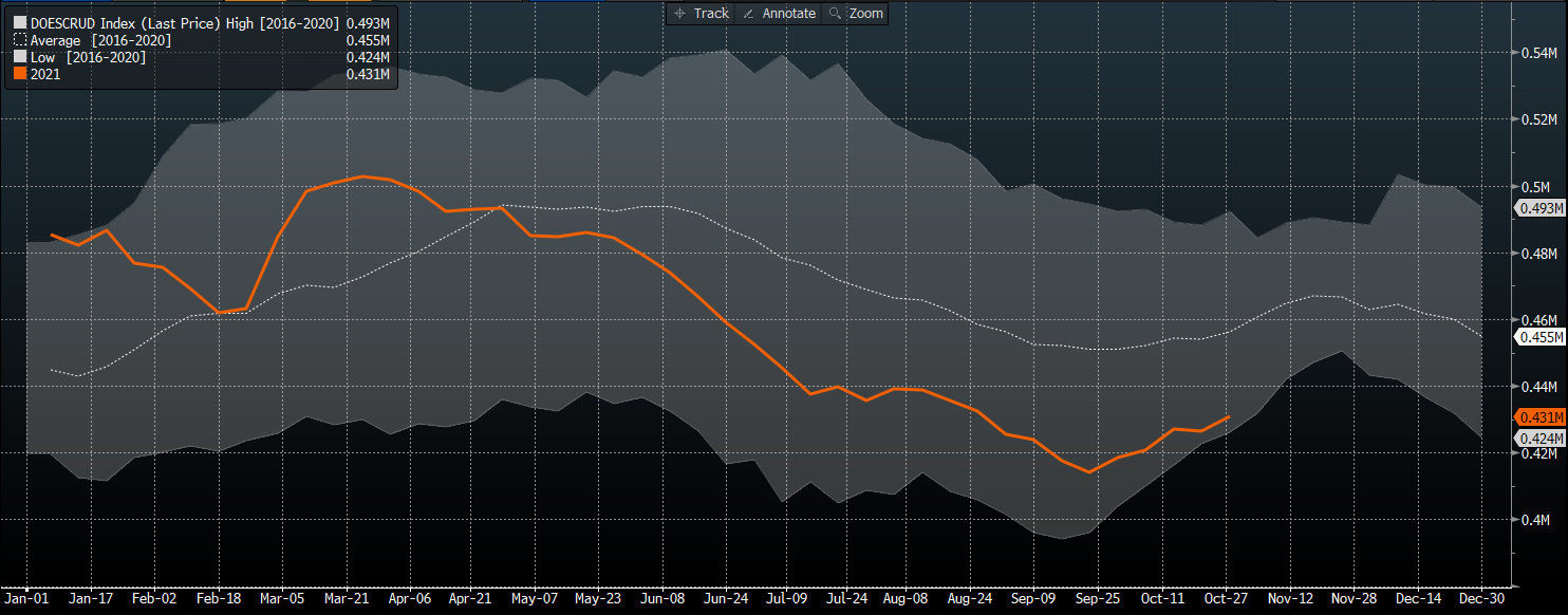 US oil inventories increased slightly last week but continue to hover near a 5-year lower for the current period. Source: Bloomberg