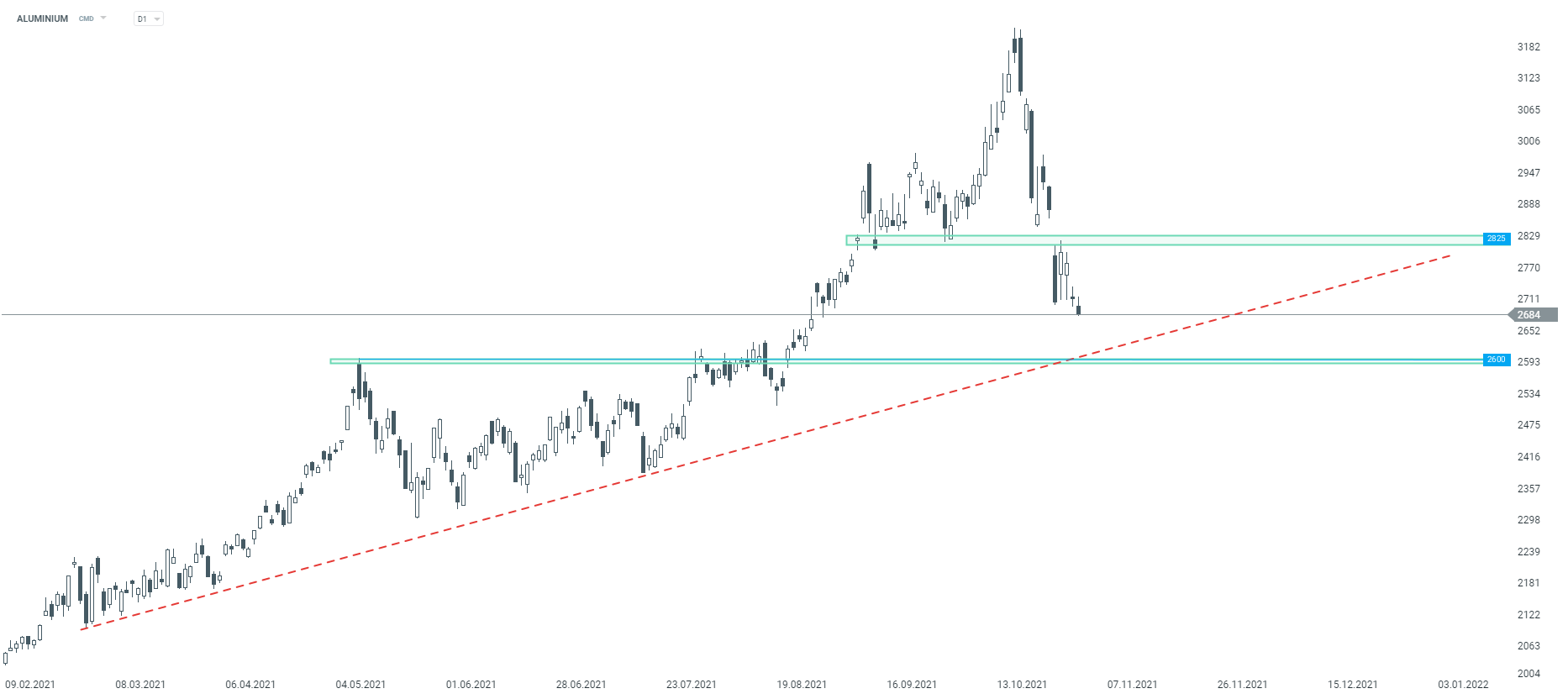 Aluminium, just like other industrial metals, declined recently. Price of the base metal dropped around 15% off its recent 13-year high. Concerns over Chinese economic growth as well as removal of US tariffs on EU metals are helping to bring prices down. Price is slowly approaching the 2,600 area, where previous price reactions as well as the upward trendline can be found. Source: xStation5