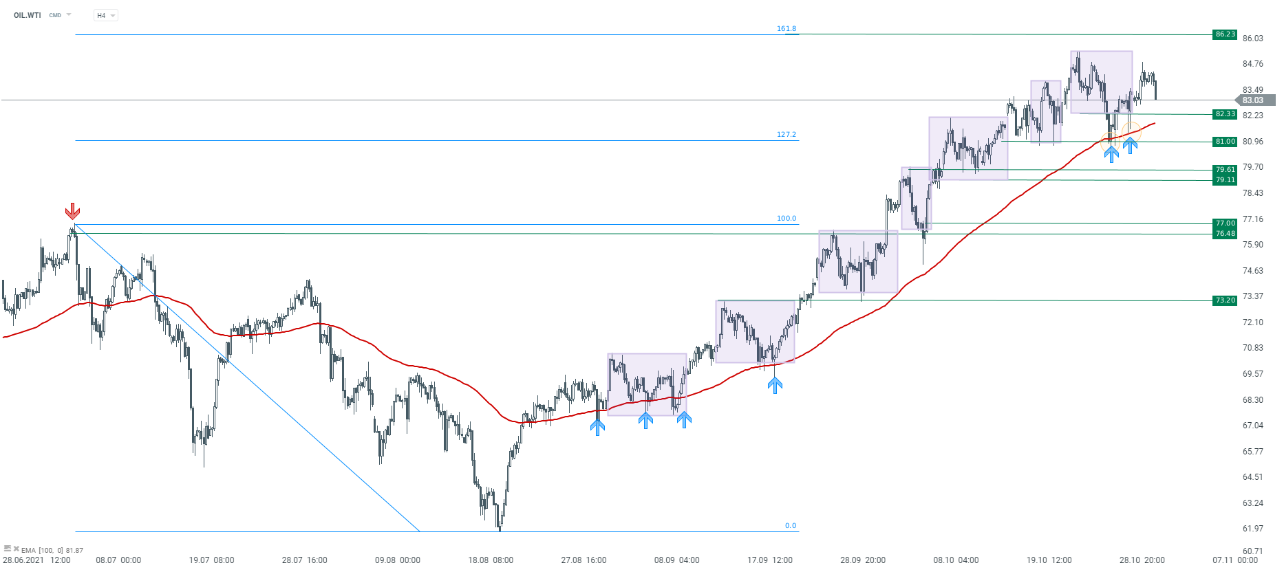 WTI (OIL.WTI) failed to fully recover from a recent drop as the market resumed slide today. Price dropped to $83.00, a zone that saw some price reactions last night. Nevertheless, key support to watch is marked with 100-period EMA (red line, H4 interval) as this moving average halted sell-offs on the final days of October. Source: xStation5