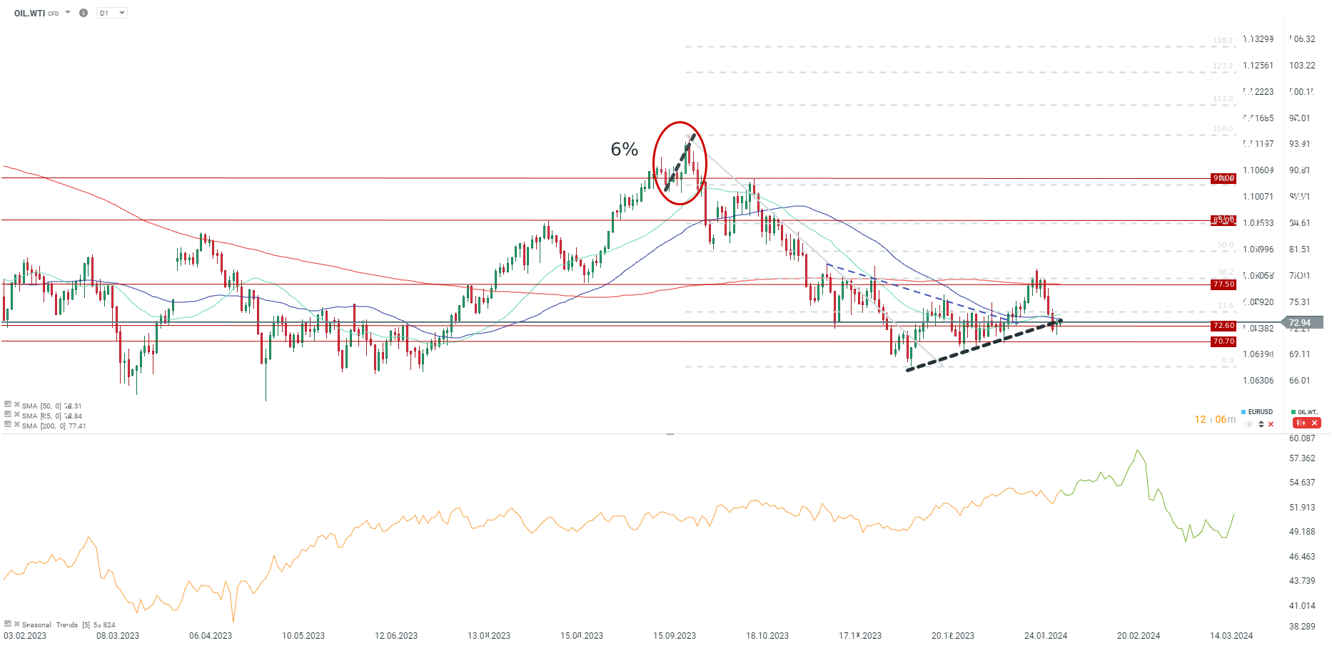 Crude oil is stabilizing, despite improved economic data worldwide and the ongoing tense situation in the Middle East. Meanwhile, Russia is significantly reducing its exports due to infrastructure damage, raising the possibility of an export ban, similar to what occurred in September of last year. During that time, prices increased by approximately 6% in a few days and then sharply declined in October and November upon the removal of the export ban. Source: xStation5