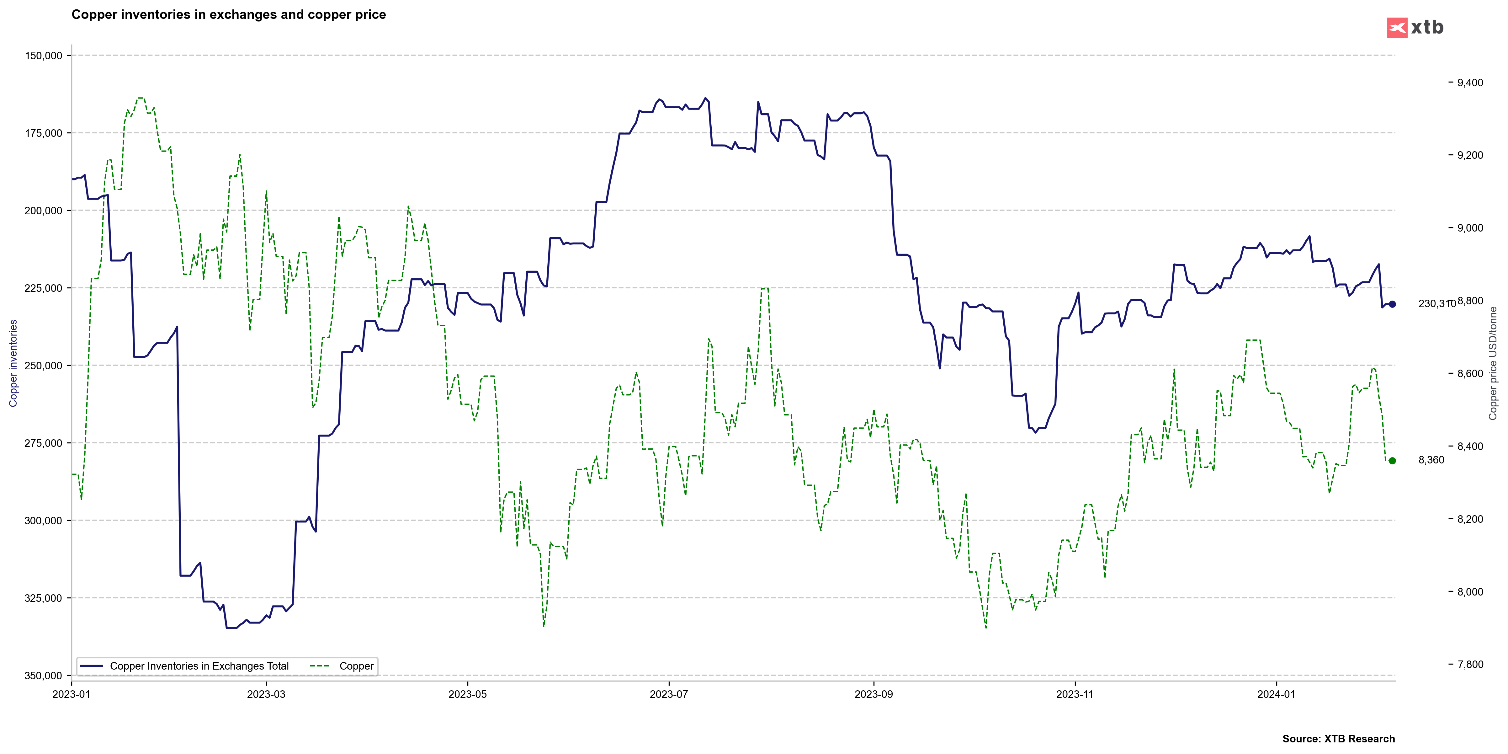 Copper inventories remain at a very low level but have stabilized in recent weeks. Source: Bloomberg Finance LP, XTB