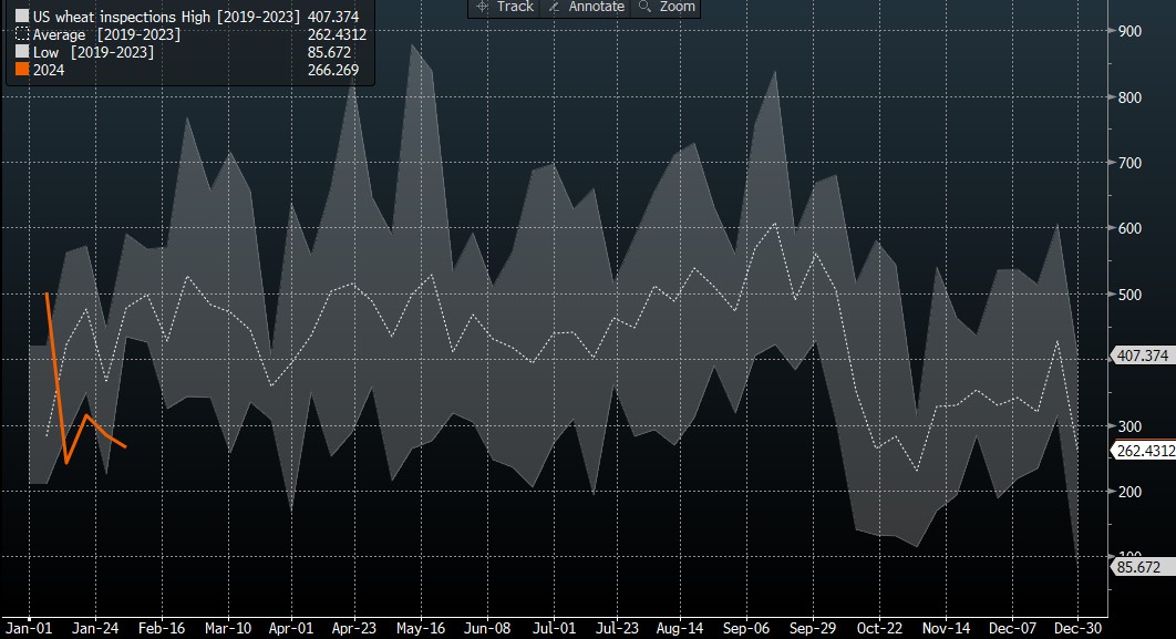 - Wheat export inspections have been lower since the beginning of this year compared to the same period the previous year, down by 18.4% year-on-year, indicating a lack of interest in American wheat
