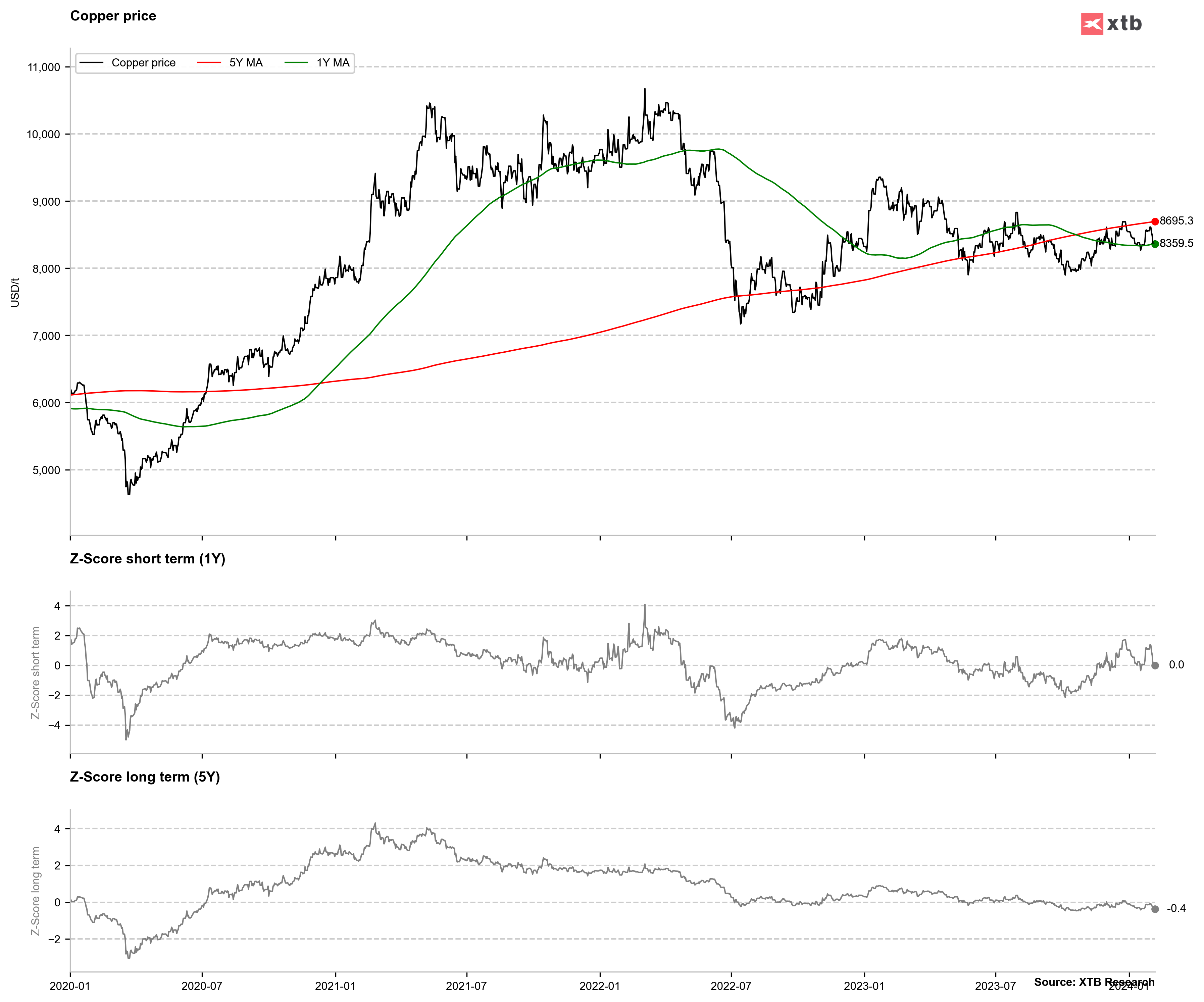Copper is well-priced relative to the 1-year average and slightly undervalued relative to the 5-year average. Source: Bloomberg Finance LP, XTB