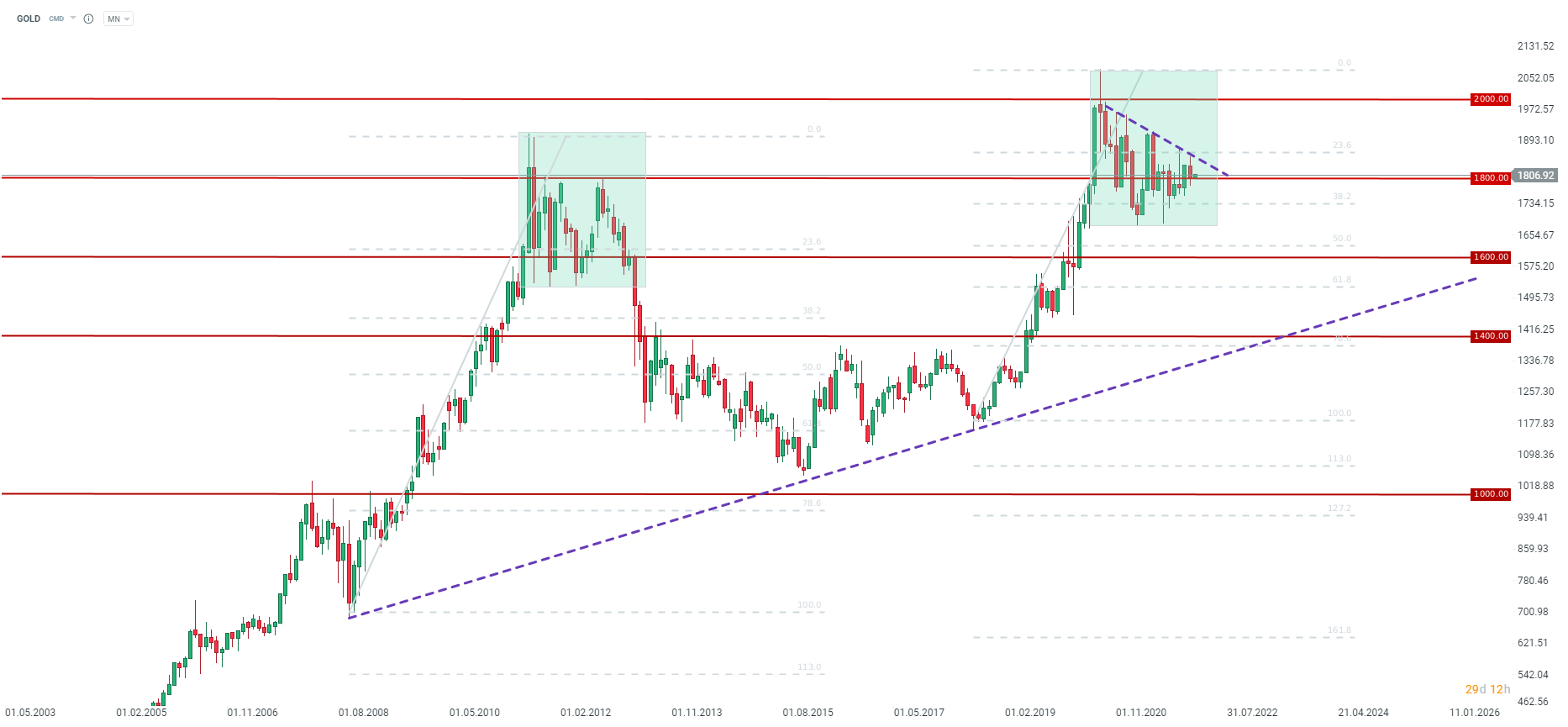 - It is worth noting that we have a similar consolidation as in 2011-2012. If the lows were broken at $1680, the price could drop to the 61.8 retracement of the last upward wave