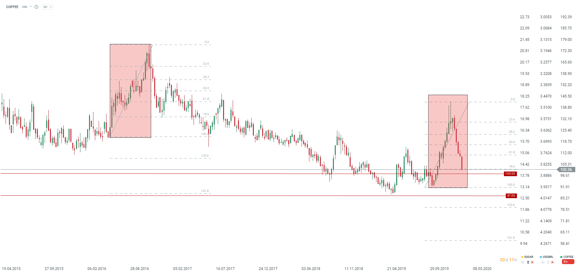 Coffee price approaches key 100 cents handle. Downward move may be halted by a recovery of BRL. Source: xStation5