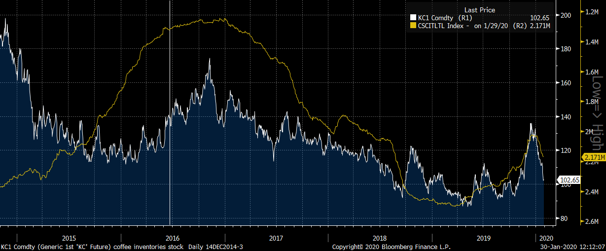 Coffee stockpiles rise significantly at the beginning of 2020. Source: Bloomberg