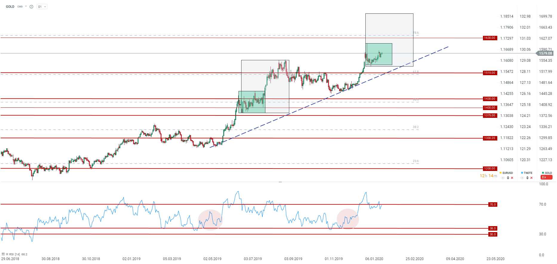 Gold trades in a sideways move at elevated level. Key support can be found at $1540 handle. Source: xStation5