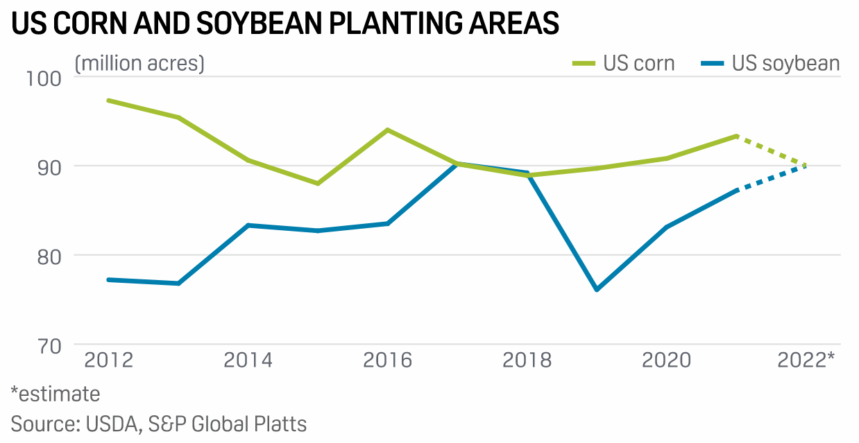 The expectations point to a reduction in corn production acreage, which, amid increased demand, may lead to further upward pressure on prices. Source: S&P Platts