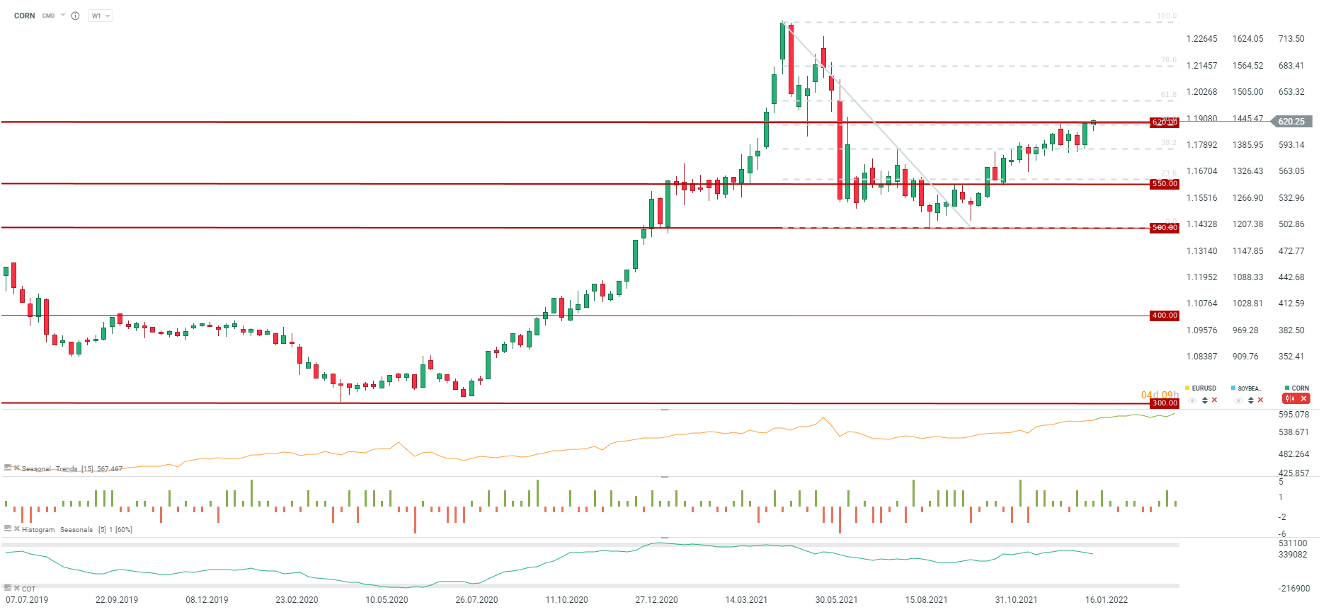 Corn price is testing the 50.0% Fibonacci retracement of the last downward move. Prices last year consolidated in February, but the upward movement resumed in March. Source: xStation5