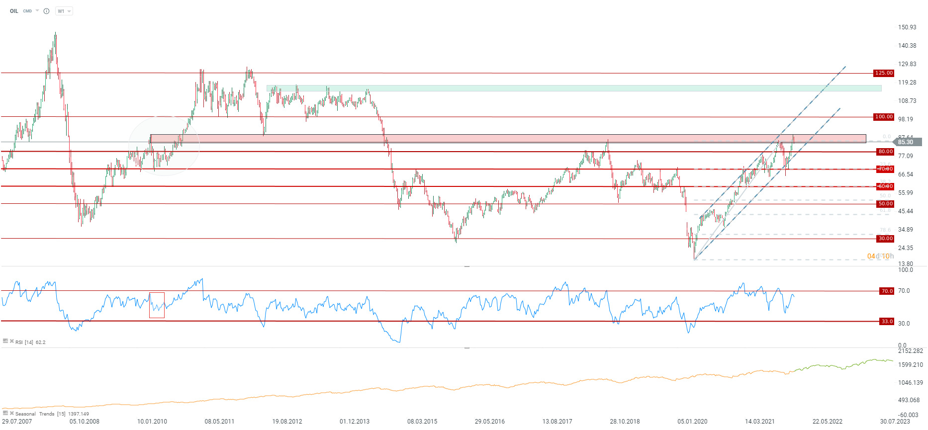 Crude oil has receded somewhat from the major supply zone. However should break higher occur, the next target for bulls is located at $ 100, which is marked with the local lows from 2012. Source: xStation5
