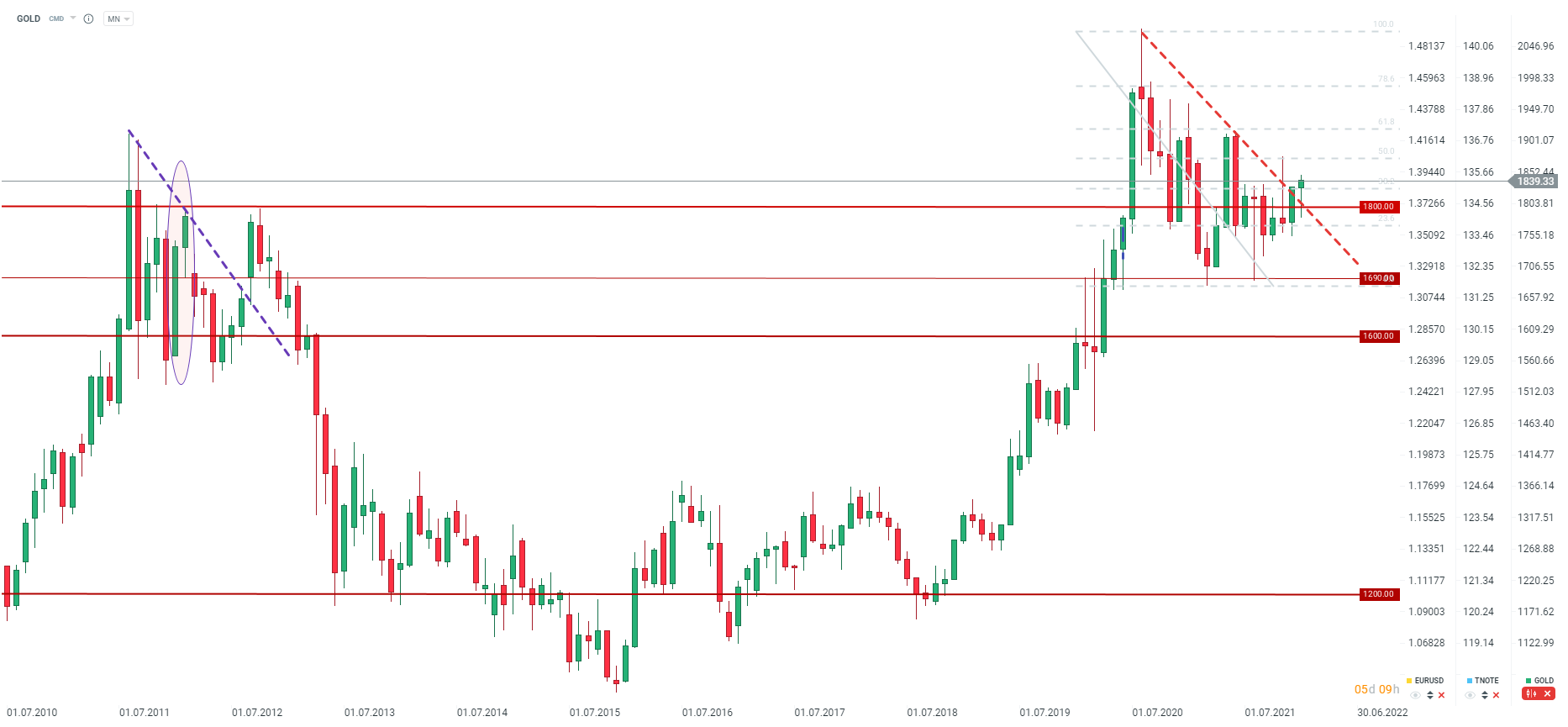 Gold is gaining this month, but an analogy can be seen in what happened in 2011-2013, and in particular in 2012, when gold was testing $ 1,800 level. Source: xStation5