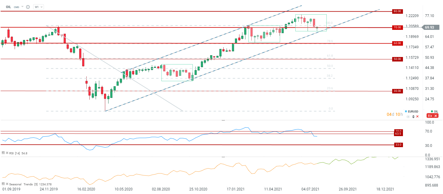 Potential demand signal on OIL at W1 interval. A potential bullish pattern may suraace on the chart near key support at $70. Source: xStation5
