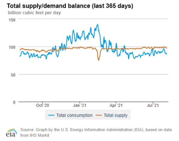 Natural gas inventories increase slower than the 5-year average. Limited supply contributes to such a situation. Supply is near 5-year low for the current period