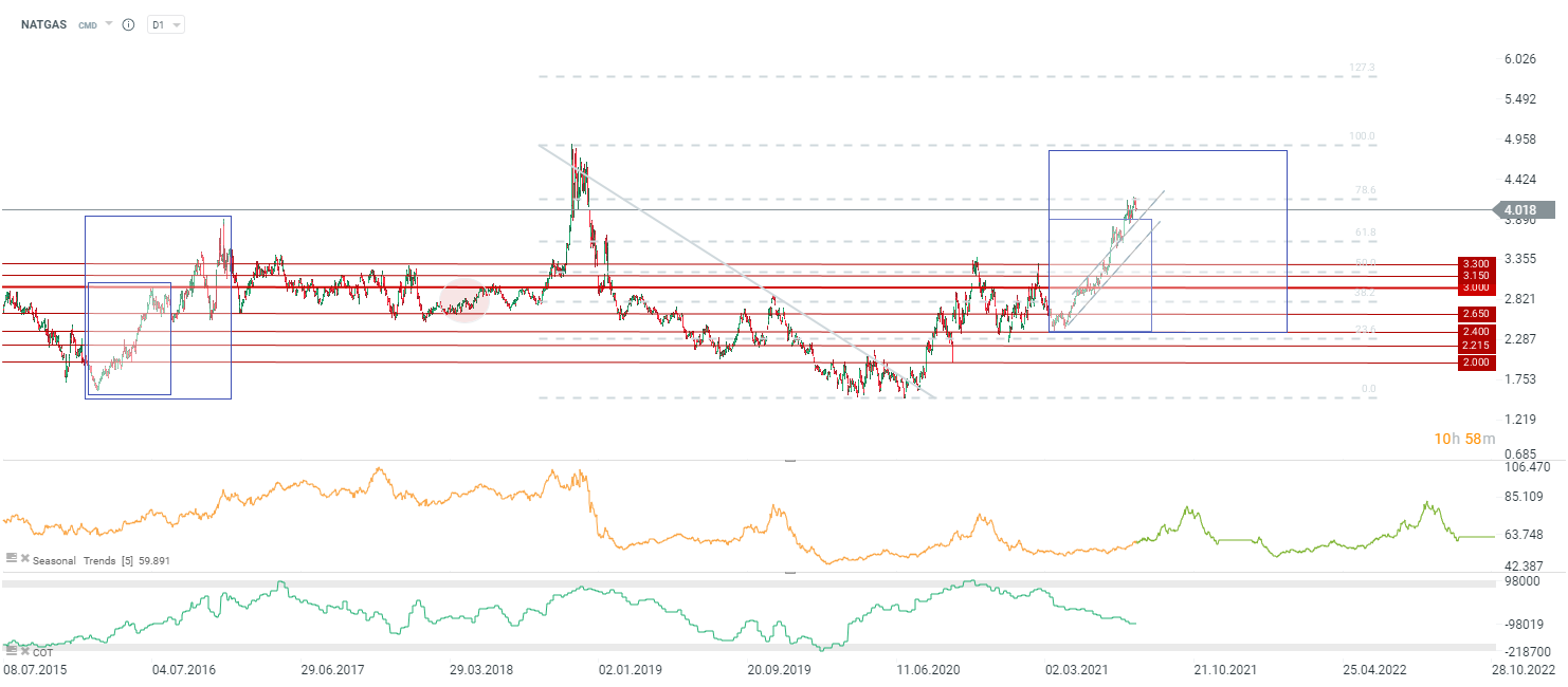 Natural gas prices pulled back after recent steep gains. An important support can be found ahead - upper limit of the earlier broken upward channel. Seasonal patterns suggest that bigger upward moves should begin in fall-winter period. Source: xStation5