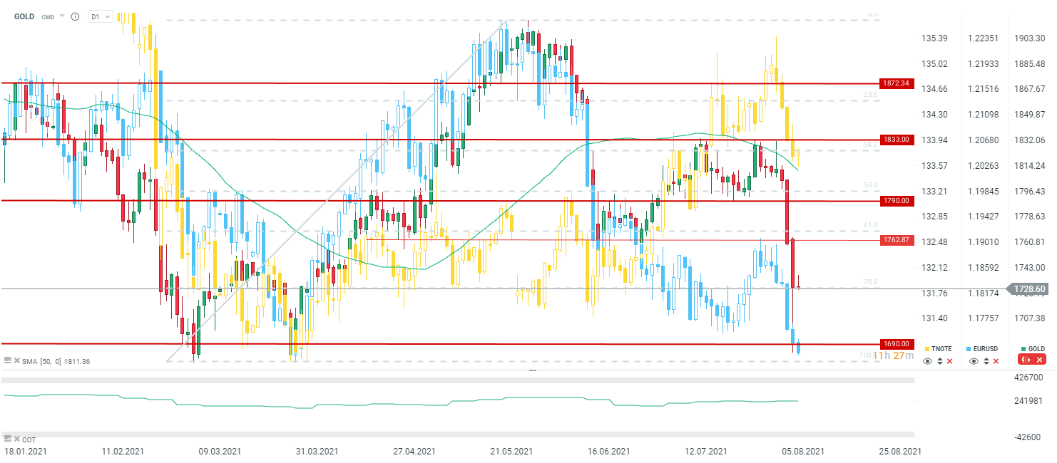 78.6% retracement looks to be an important level for bulls. Drop below this area can pave the way for a retest of the $1,700 zone, given the 1.1700 level of EURUSD. Source: xStation5