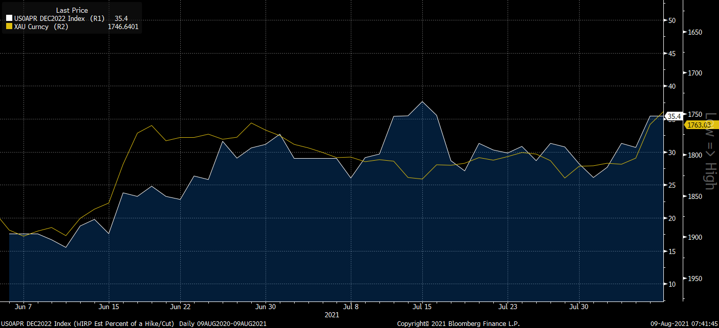 Market odds of rate hike in December 2022 and gold price. Source: Bloomberg