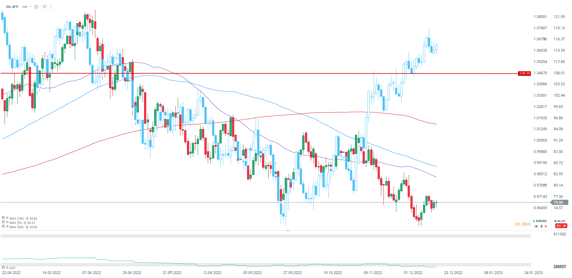Oil prices continues to trade under pressure. WTI needs to break above the price zone marked with 50- and 100-day moving averages for a trend reversal to occur. It should be noted that oil trades in significant divergence to EURUSD. Source: xStation5