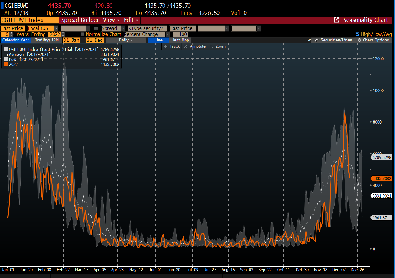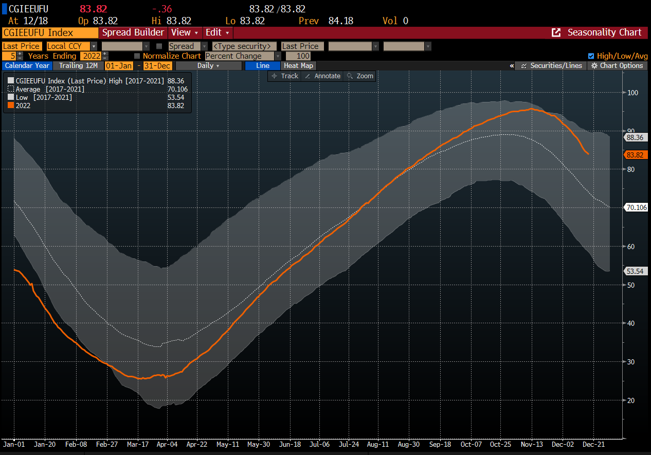 Warehouses in Europe are approximately 84% full, with a 5-year average of 74%. Source: Bloomberg