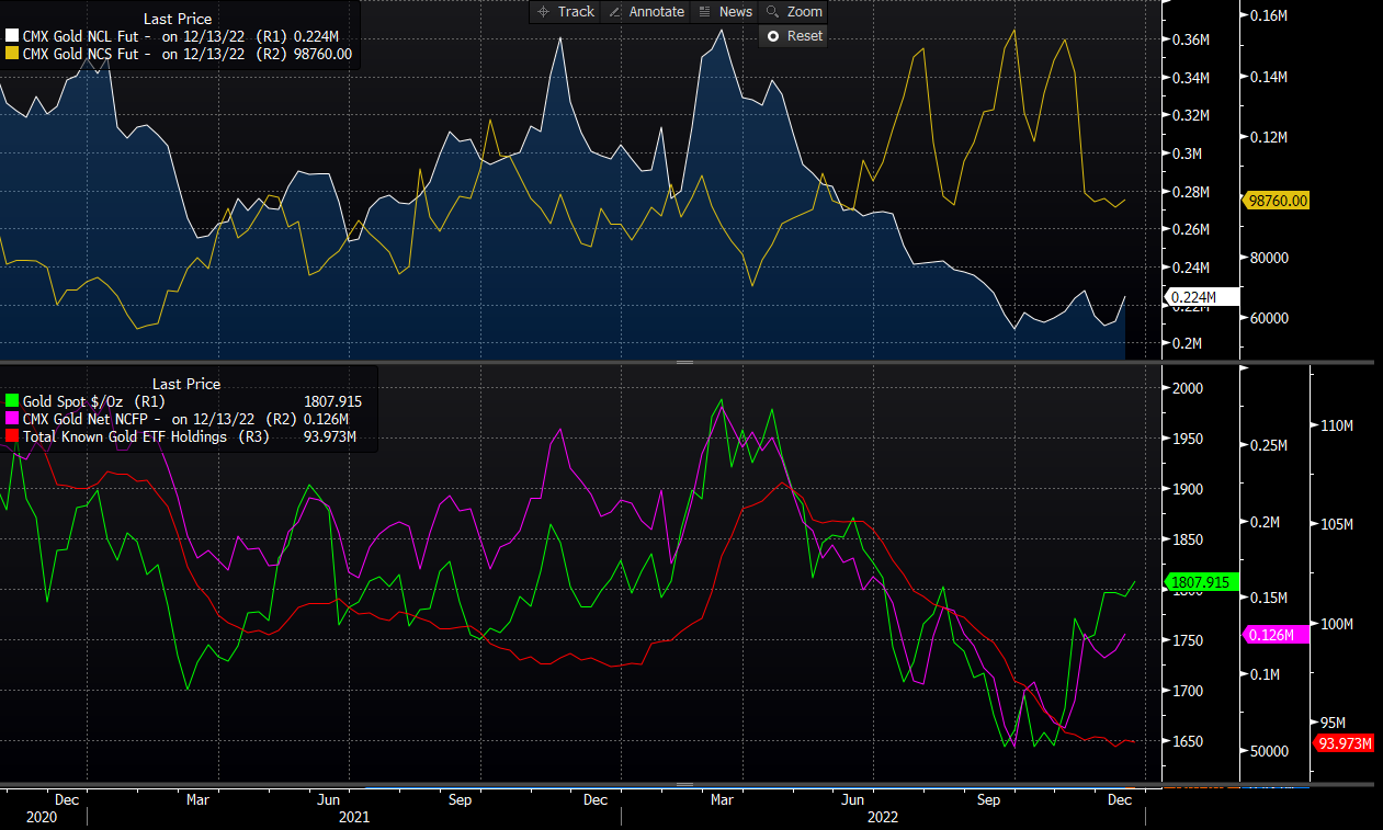 In spite of very hawkish central banks, gold prices holds at elevated levels and speculative buyers start to emerge. Source: Bloomberg