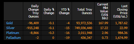 ETFs have been selling out precious metals this year. Source: Bloomberg