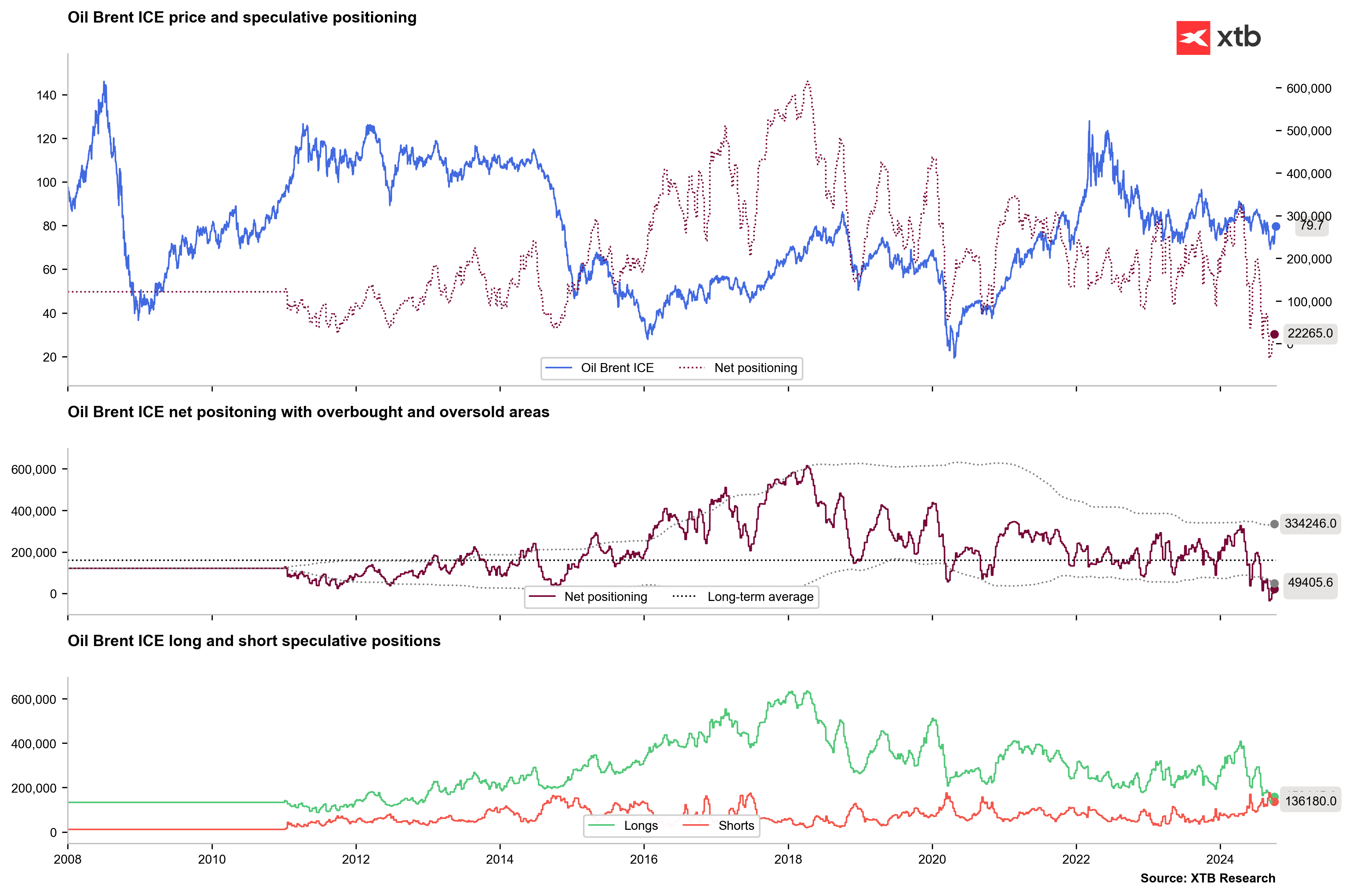 - Record-low positioning on Brent crude is starting to rebound. Long positions are increasing, and short positions are being reduced. Net positions are returning to above zero levels.