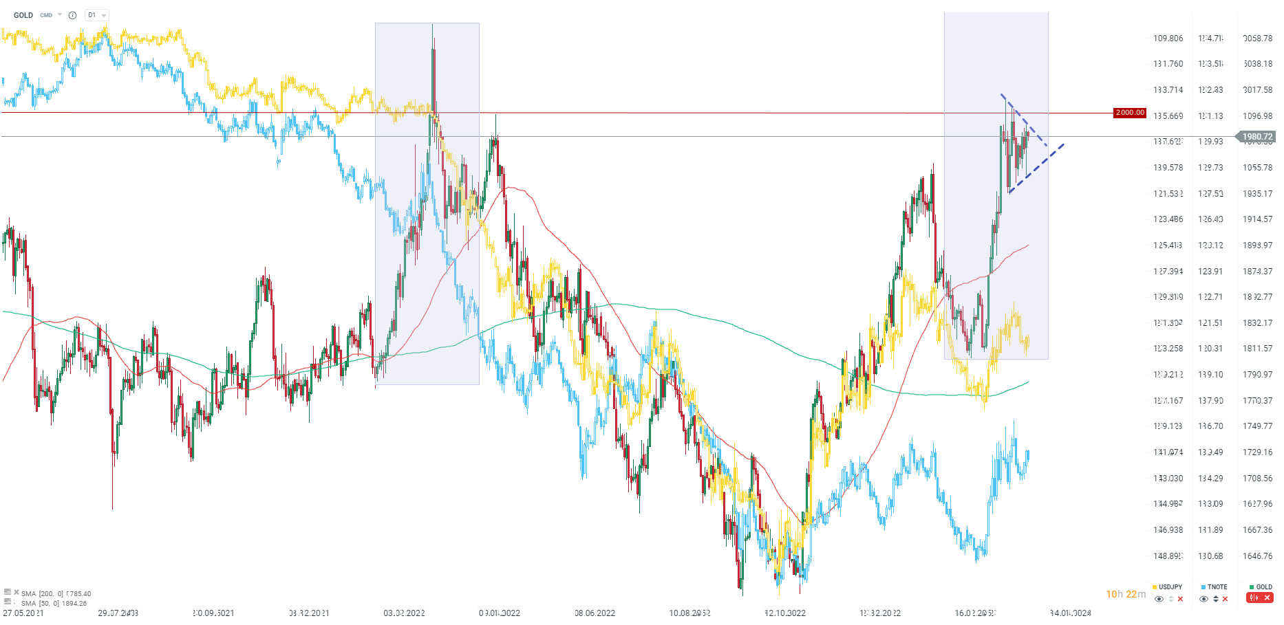 The price is consolidating inside a triangle pattern, waiting for a signal from the dollar or yields. Source: xStation5