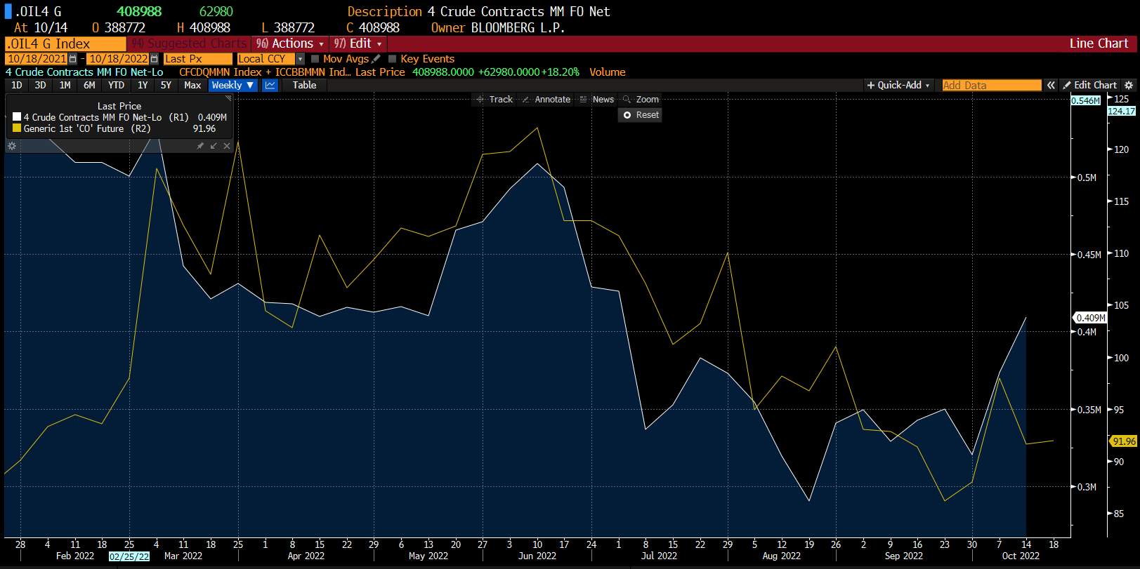 Net speculative positioning on oil climbed to the highest level since July. Source: Bloomberg