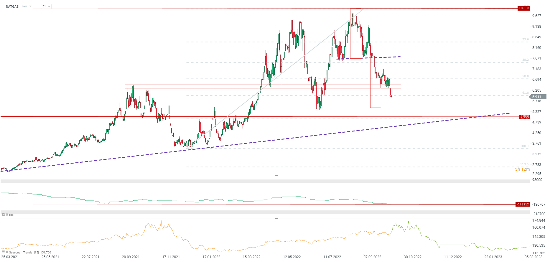 Natural gas price dropped below 61.8% retracement of this year's upward impulse. Key support for natural gas can be found in the $5 per MMBTu area. However, a $5.30 area should also be watched closely as it marks the range of the head and shoulders pattern. Source: xStation5