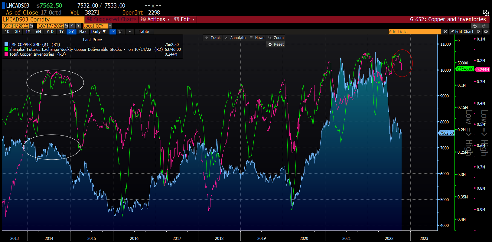 Copper inventories in China and globally start to rebound, similar to the situation from 2014. Source: Bloomberg