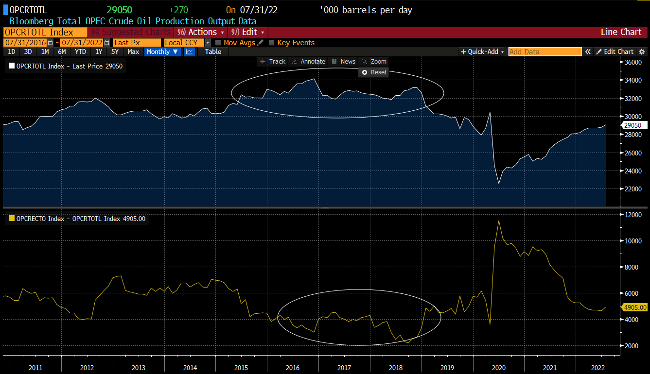 OPEC production is nowhere near as big as in 2017-2018 record period. However, spare production capacity is almost as low as it was back then, meaning that OPEC is unable to return to pre-pandemic output levels. Oil market will remain tight unless demand destruction occurs. Source: Bloomberg
