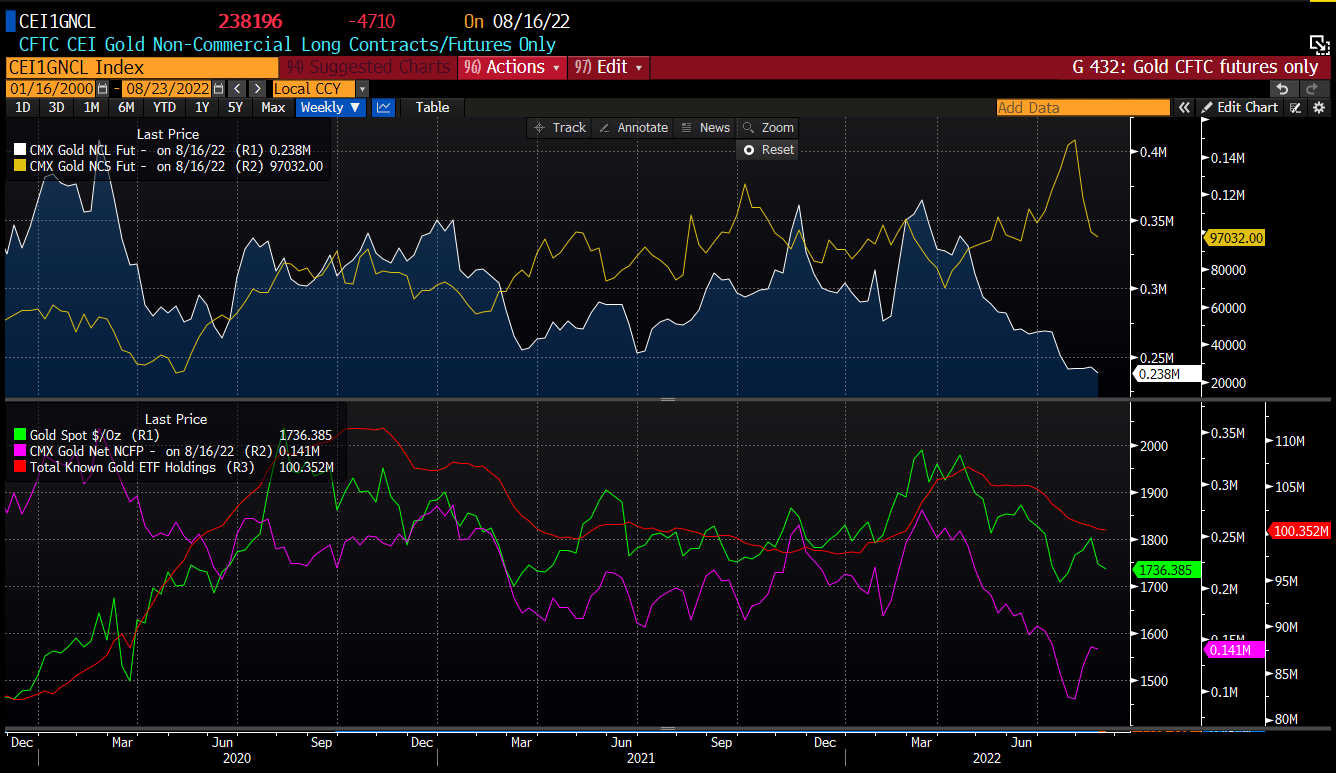 Number of open short positions on gold dropped significantly in recent weeks. However, ETFs continue to sell gold holdings. Source: Bloomberg
