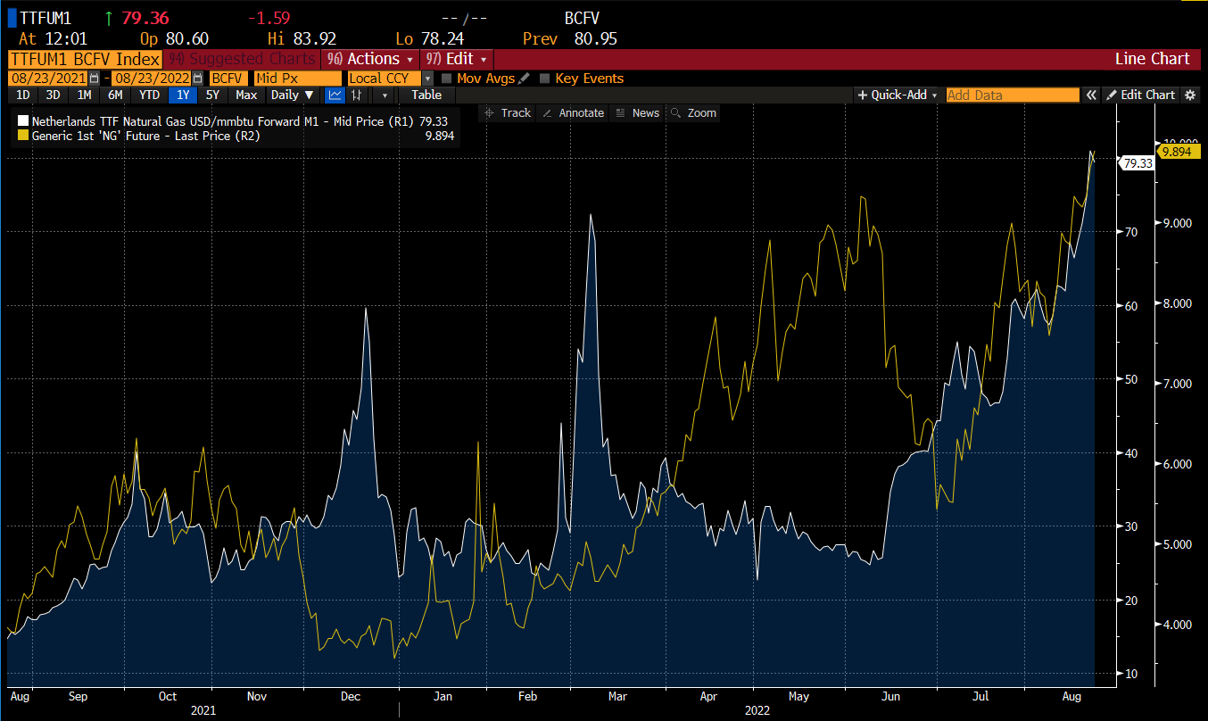 European gas prices reach fresh records. Prices exceed €270 per MWh, what translates to around $80 per MMBtu. This is an 8 times higher price than in the United States