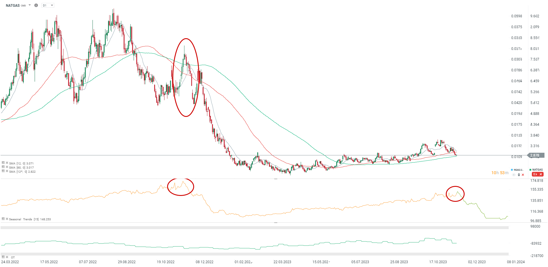 The seasonal peak (although not from an annual perspective) occurred on November 23 last year. We then had a further increase in December. Price should return above $3 after contract rollover, but current fundamentals do not indicate a major rally in the near future, although, of course, any significant movements will depend on the weather. Source: xStation5