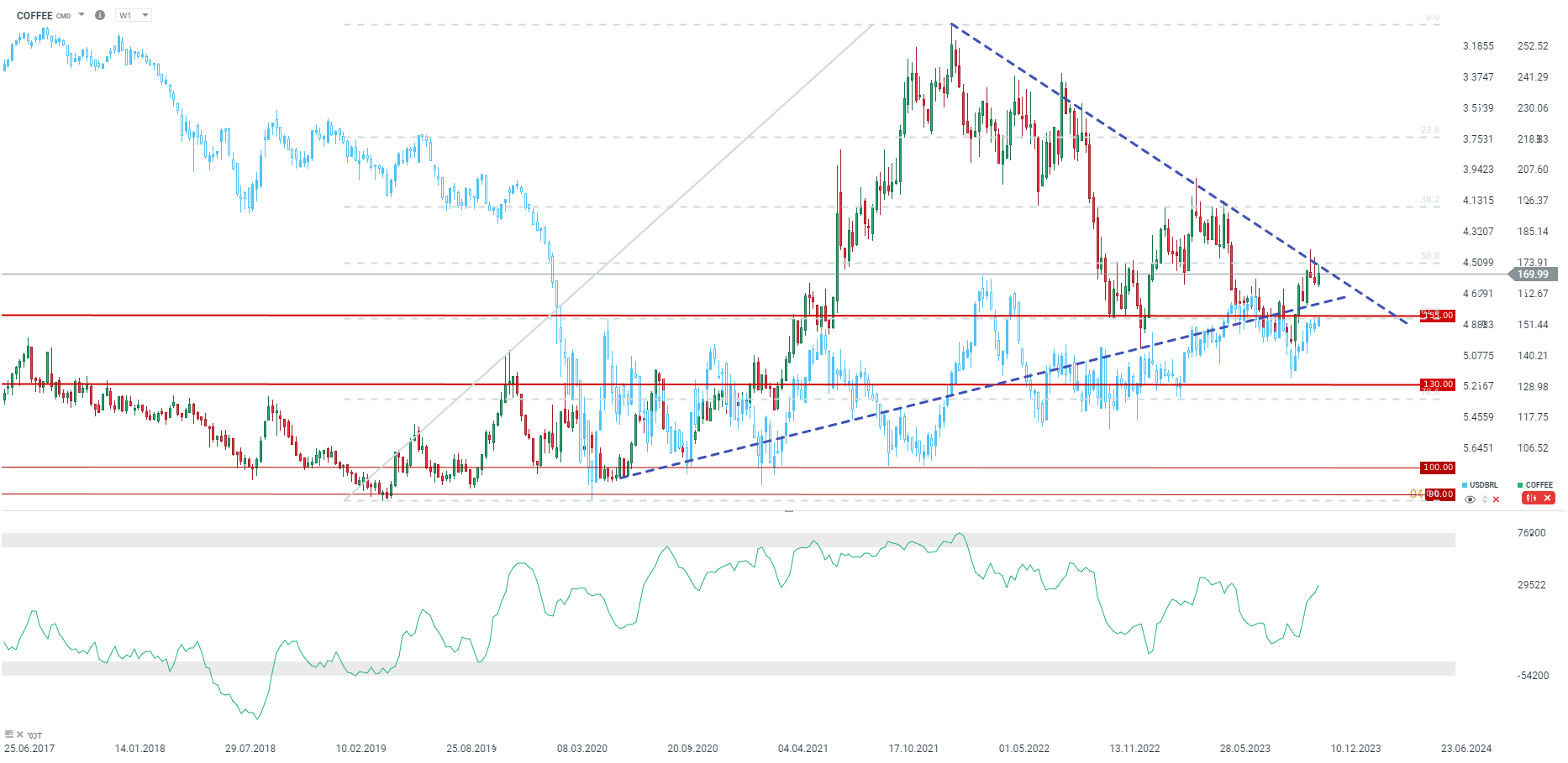 COFFEE struggles with a break above the 175 cents per pound resistance, marked with a 50% retracement of the last major upward impulse. It should also be noted that speculative positioning is rising. Source: xStation5
