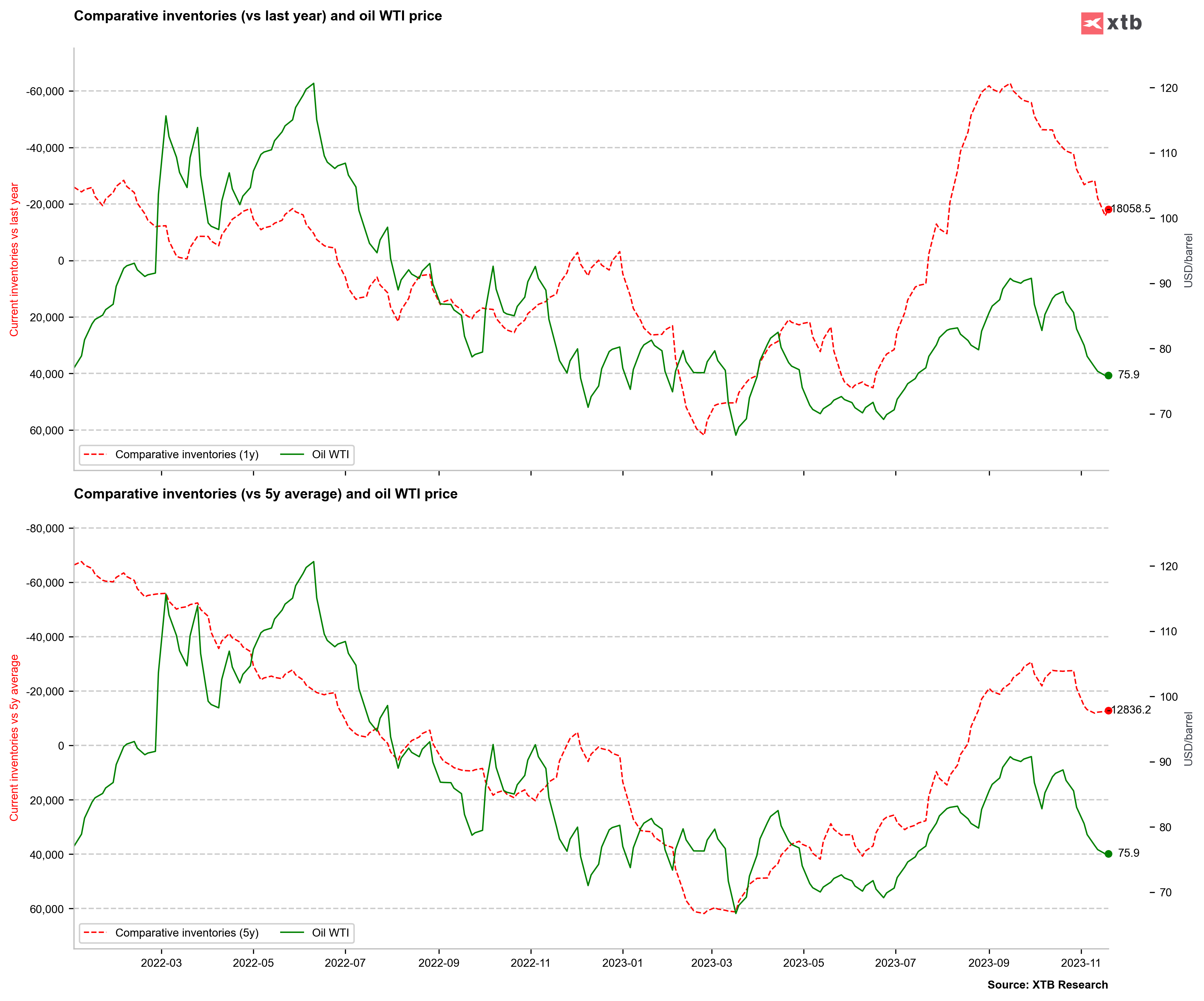 Comparative inventories have clearly rebounded recently, explaining declines in oil prices. Source: Bloomberg Finance LP, XTB Research