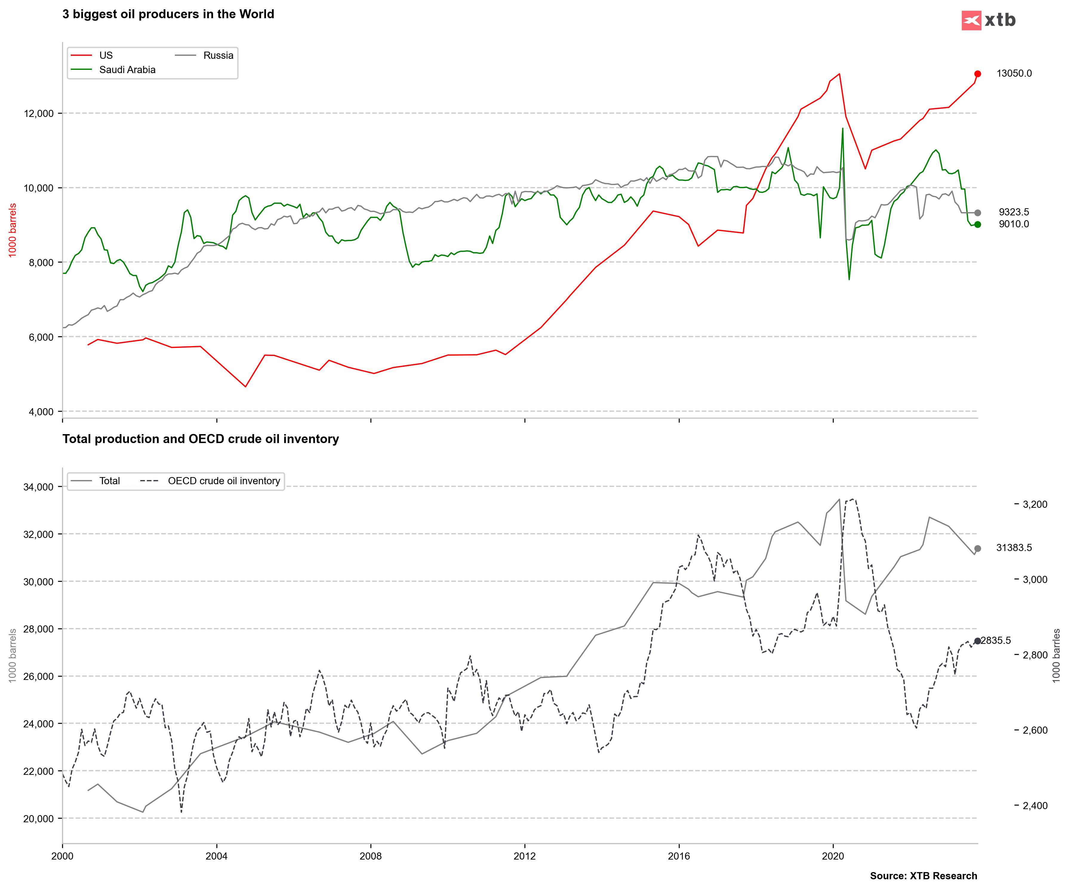 Output from 3 largest oil producers remains elevated in spite of relatively low production from 2 OPEC+ members. The question is for how long Saudi Arabia will be willing to give up its share of the market. Source: Bloomberg Finance LP, XTB Research