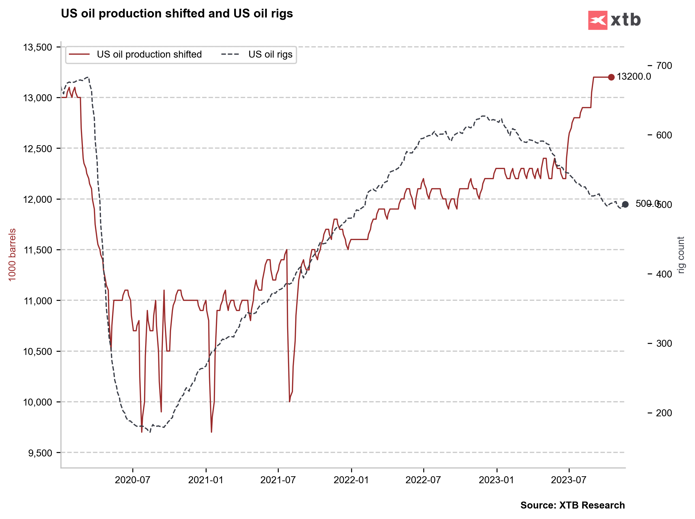 US oil production climbed above 13.2 million barrels per day according to weekly estimates. Meanwhile, number of oil rigs continues to drop. Source: Bloomberg Finance LP, XTB Research