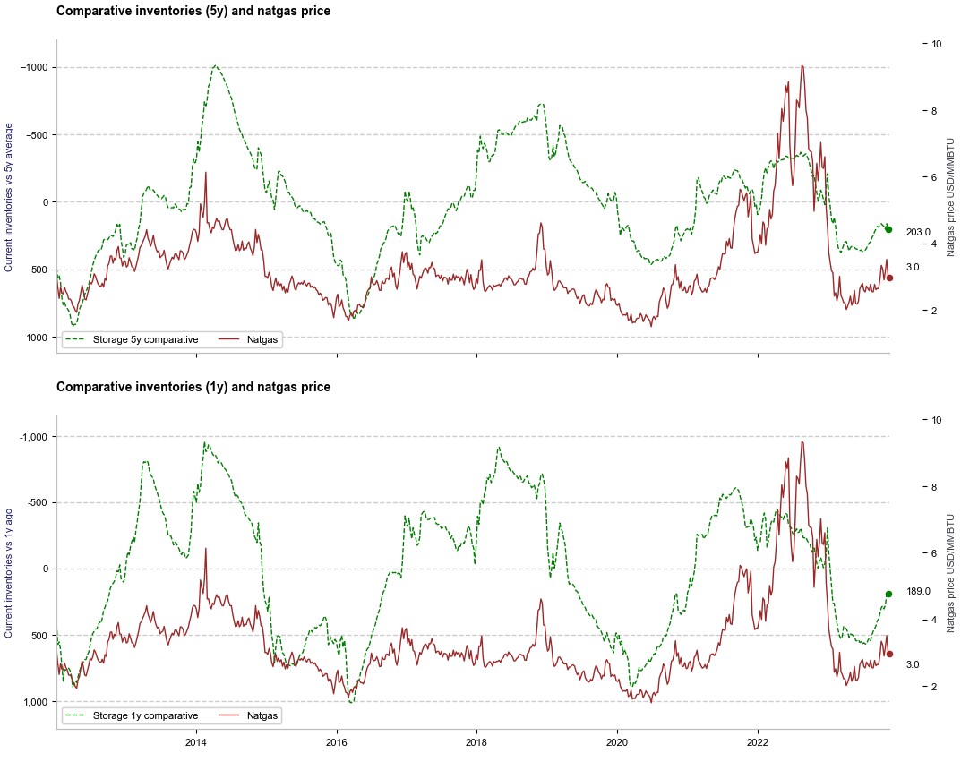 - Natural gas is falling below 3 USD/MMBTU, but it's important to consider the rolling process, which is likely to lead to prices returning above this level