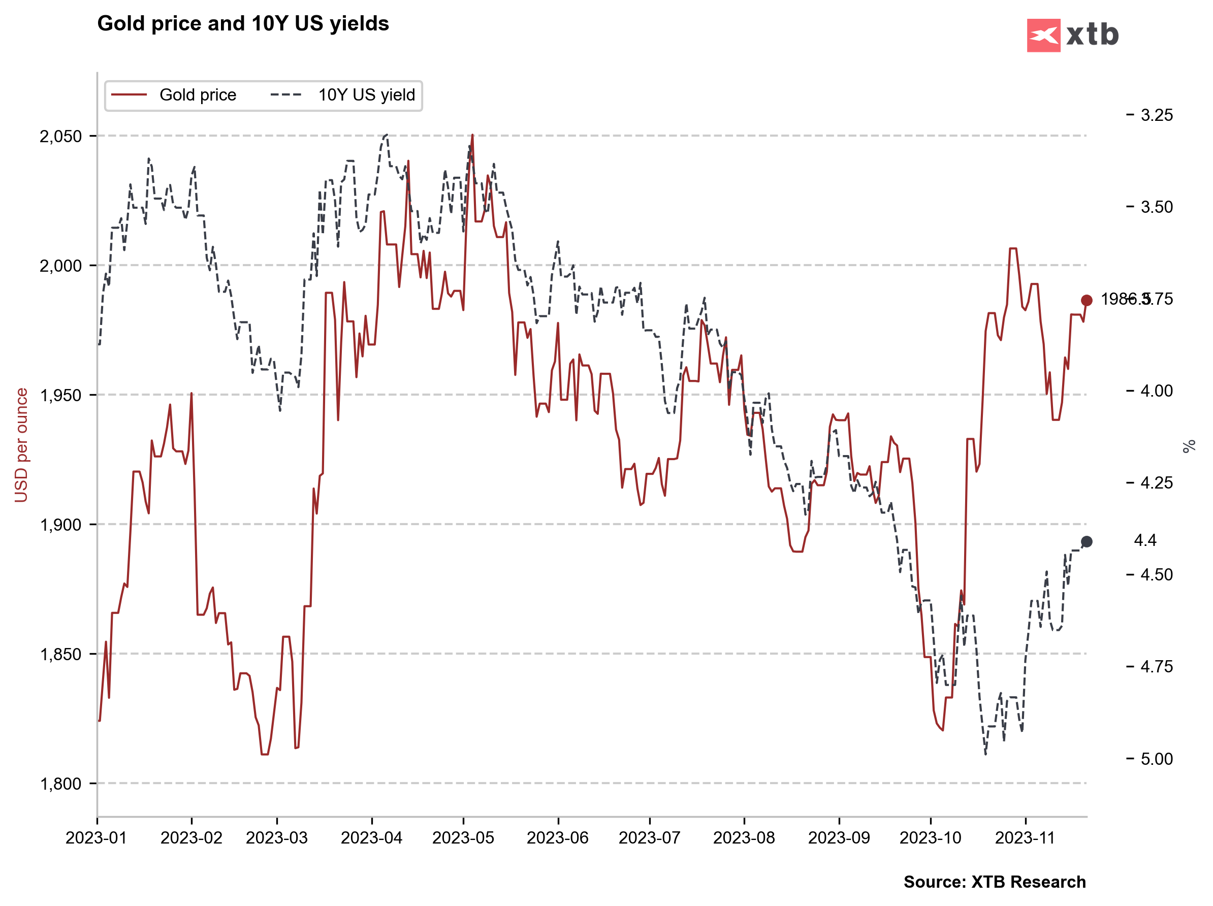 Bond yields have already dropped from around 5% to 4.4%. The long-term assessment for the Fed interest rate is 2.5%, so even with a very high risk premium, pullback in yields should aim for at least around 3.5%. Source: Bloomberg Finance LP, XTB Research