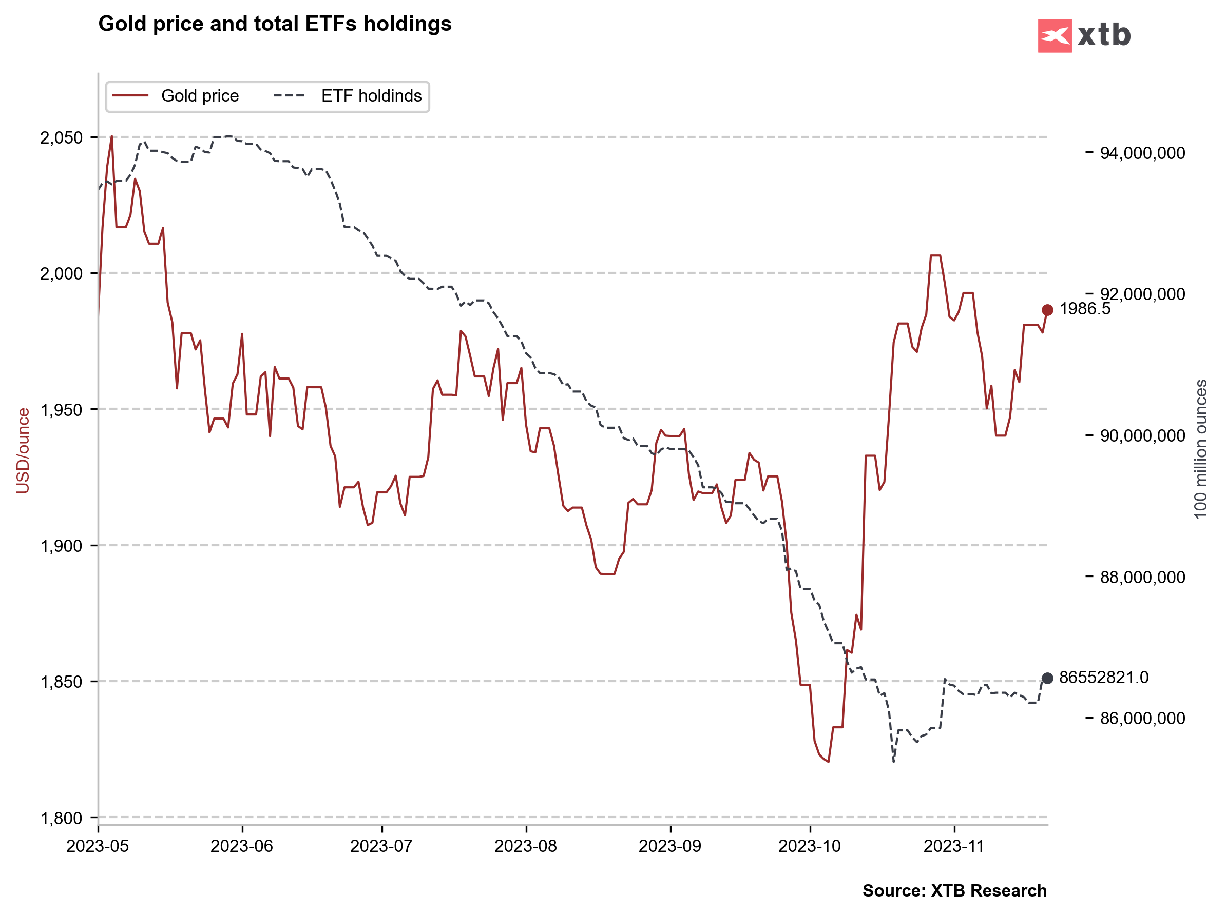 ETF funds have ceased selling gold. If funds also start flowing into gold ETFs, we could get the "last" piece of the puzzle for positive fundamentals in gold. Source: Bloomberg Finance LP, XTB Research