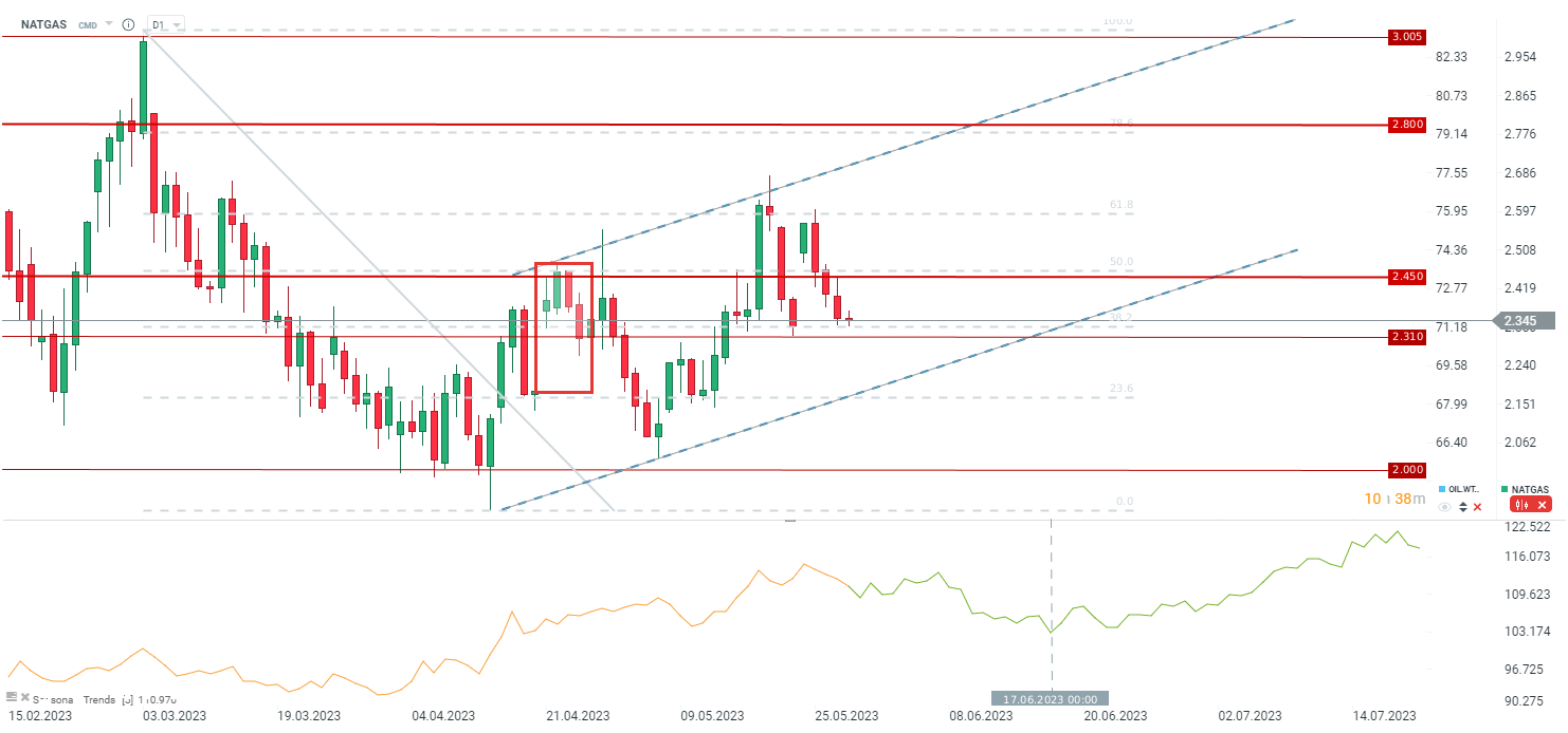 NATGAS is currently testing an important support zone ranging above $2.3 per MMBtu. Seasonal patterns suggest that prices should trade within range and later drop in the second week of June before demand increases during cooling season in the United States. Source: xStation5