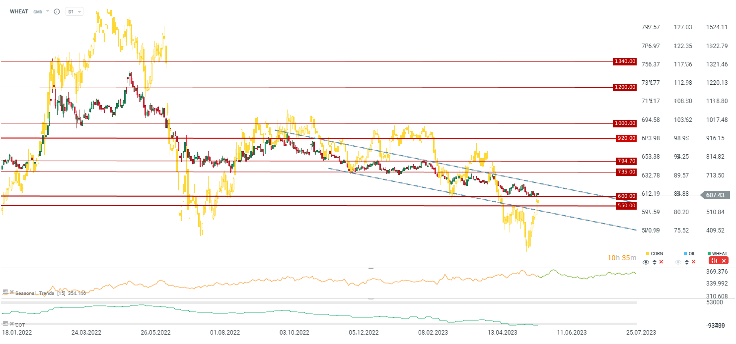 Wheat prices is testing 600 cents per bushel area. The 550-600 area has been an important swing level in the past and one cannot rule out that demand-side reaction will occur there. Simultaneously, one can note that corn prices started to rebound even though the situation in terms of oversupply or positioning is similar to wheat. Source: xStation5