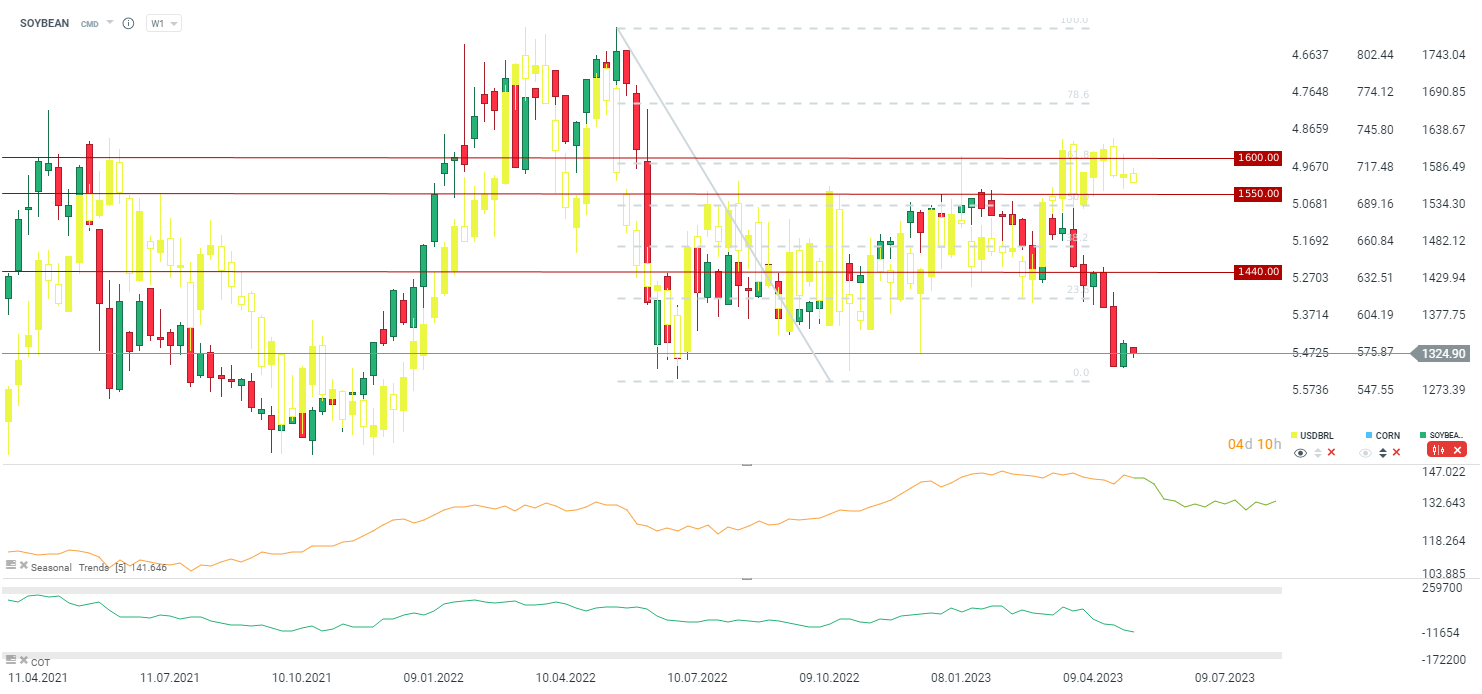SOYBEAN has been testing local lows from July 2022 recently and trades with a large divergence to Brazilian real. Seasonal patterns suggest continuation of a downward move but uncertainty relating to US crops and drought may trigger a price rebound off an extremely low levels. Source: xStation5