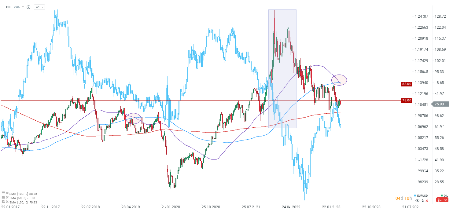 Brent (OIL) is pulling back from the $78 per barrel area in spite of a rebound on EURUSD this week. An important technical signal was generated last week - a drop of 50-period moving average below 100-period moving average. Source: xStation5