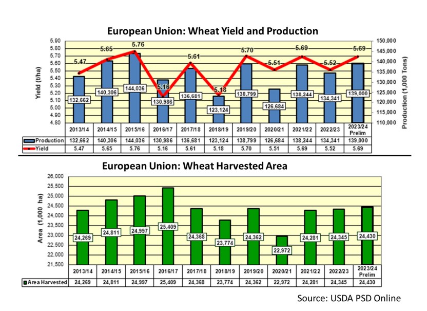 This year's harvest area in the European Union is expected to be the biggest since 2016/17 season. Production and crop yield is expected to be the highest since 2019/20 season. Source: USDA