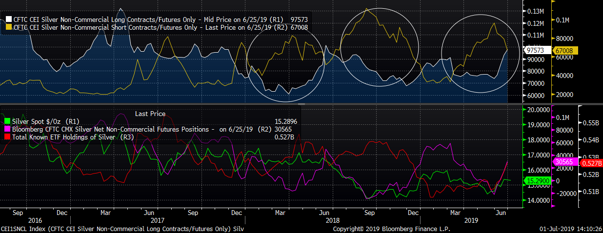 - ETFs are increasing their silver holdings at the fastest pace since the first half of 2017. Net speculative position for silver is rising.