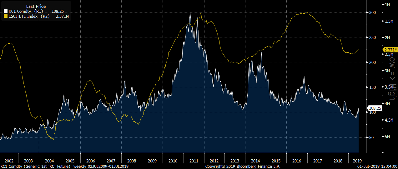 - Concerns over potential light frost in Brazil that may harm next year’s crop are the main driver for coffee prices right now