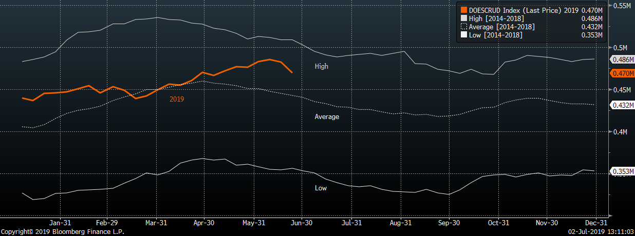 Oil stockpiles took a major dive lower in the previous week but clearly lag behind seasonal patterns. Source: Bloomberg