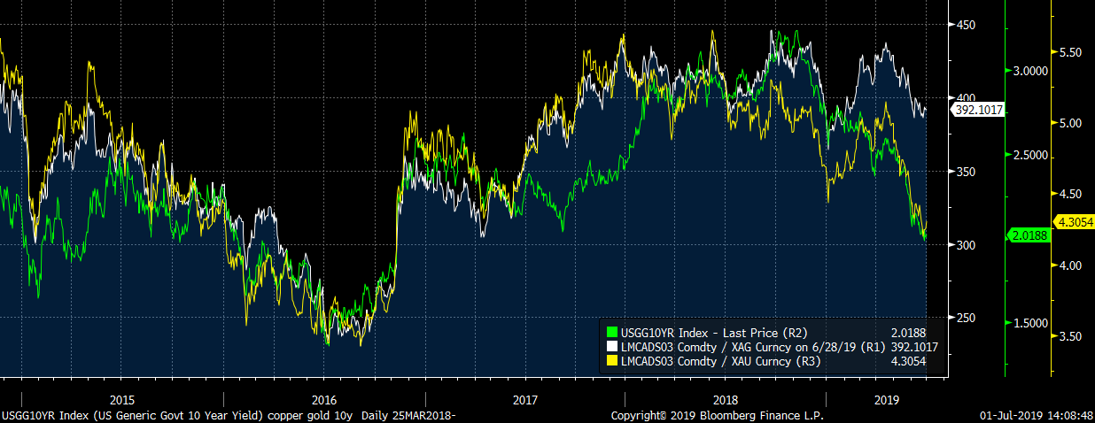 Copper-to-silver price ratio is high compared to the 10-year US yields. Copper may underperform silver in case the divergence is to be closed. Source: Bloomberg